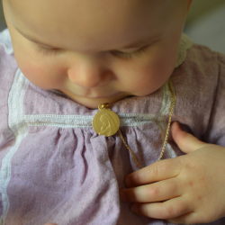 La Mère Sainte est une médaille de baptême magnifique, c'est une création exclusive de la Maison Laudate. Cette jolie médaille de baptême en or jaune 9 carats représente tendrement la Vierge portant un long voile, et tenant au creux de ses bras l'enfant Jésus qu'elle protège avec beaucoup de douceur. La médaille 9 carats est un alliage de métaux (argent, cuivre,... avec 37,5 % d'or pur). Cette médaille de baptême fait un diamètre de 18mm. Pour assortir votre médaille, nous vous proposons plusieurs chaînes de baptême en or 9 ou 18 carats.