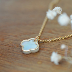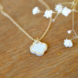Ce pendentif en or jaune 18 carats et nacre séduit par son allure moderne et raffinée. Sa forme délicate de trèfle évoque à la fois une croix romane, un trèfle porte-bonheur ou une fleur lumineuse, selon la sensibilité de chacun. La nacre blanche est mise en valeur par un contour d’or finement travaillé, indépendant de la nacre, créant un subtil jeu de lumière et de relief. Disponible également en nacre grise sur notre site, ce bijou élégant se porte à tout âge, sur une chaîne en or pour un rendu à la fois sobre et précieux.