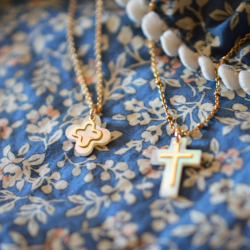 La Croix Romaine en Or Jaune 18 Carats et Nacre allie tradition et élégance. Symbole puissant de la foi chrétienne, ce collier se pare de la douceur du nacre pour offrir une touche de raffinement intemporel. Il se porte à tout âge, que ce soit sur une chaîne en or ou un collier oméga.