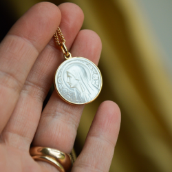 Façonnée en nacre véritable, subtilement irisée, la médaille est cerclée d’or 18 carats, un écrin lumineux pour ce symbole sacré. L’églantier, avec sa simplicité raffinée, s’invite délicatement autour de la Vierge, créant une alliance parfaite entre la nature et le divin.