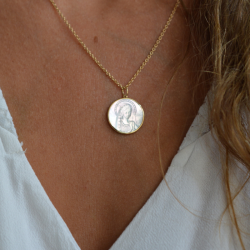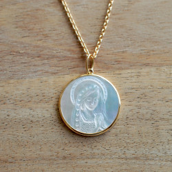 Façonnée en nacre véritable, cette médaille irradie de douce lumière, rehaussée par un cerclage en or 18 carats. La nacre capte et reflète les rayons lumineux, soulignant la pureté et la majesté de la Vierge. Le voile étoilé devient ainsi un symbole de grâce infinie et de lumière divine, invitant à la prière et à la méditation.