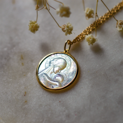 D’un diamètre de 18mm, cette médaille exceptionnelle est réalisée en nacre véritable, délicatement cerclée d’or 18 carats. L’alliance de la nacre irisée et de l’or jaune confère à cette médaille une élégance intemporelle et une rare délicatesse.