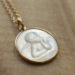 L’Ange Raphaël, guide et protecteur, se dévoile dans la douceur nacrée d’une médaille précieuse. Sur ce disque délicat, cerclé d’or 18 carats, son visage apaisé incarne la bienveillance, la guérison, et la présence invisible qui veille, éclaire et accompagne.