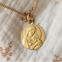 Cette magnifique médaille de baptême en or 9 carats représente si bien l'Amour éternel. Cette figure de la maternité est magnifiée par la tendre position de la Vierge qui enlace et porte son tout petit avec protection ainsi que l'auréole qui unit la mère et son Fils. Le jeu des mains en Marie et Jésus est remarquable. Vous pourrez apprécié les détails du dessin avec le petit béguin porté sur la tête de Jésus bébé. Cette médaille est une de nos nouvelles créations, issue de la collaboration avec Capucine Goalard. la médaille 9 carats est un alliage de métaux (argent, cuivre,... avec 37,5 % d'or pur). Ce modèle est également disponible en or véritable 18 carats